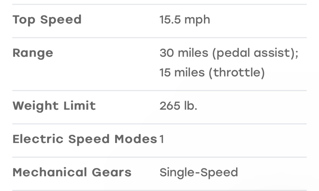 - Battery Range: About 10 miles on electric power alone — even more when you pedal!